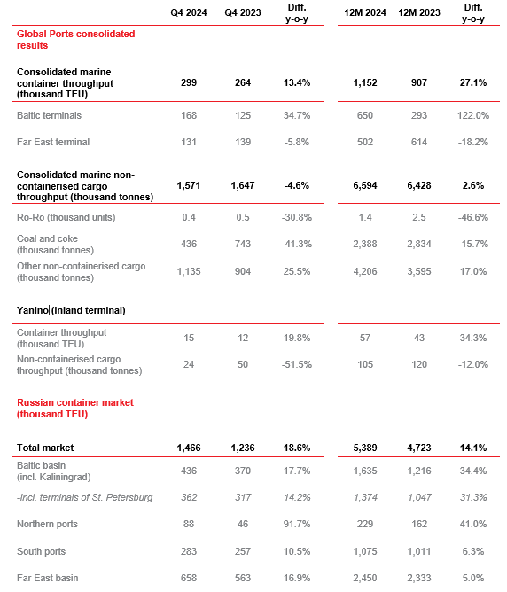 International Joint-Stock Company Global Ports Investments (“Global Ports” or the “Company”, together with its subsidiaries and joint ventures – the “Holding”, part of the Delo Group) today announces its operational results for Q4 and 12M 2024.