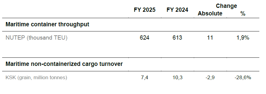 NUTEP increased container throughput by 1.9% year on year to 624,000 TEU in 2025. The terminal remained the volume leader in the Azov-Black Sea basin, ranked second among Russia’s container terminals overall, and retained its leading position in container exports.